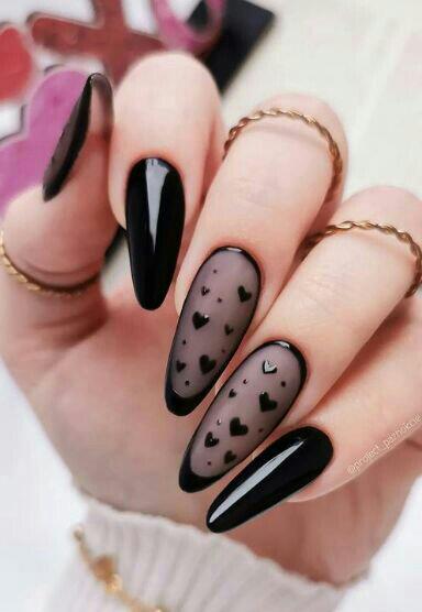 A matte nude base with scattered black hearts gives these nails a cute yet edgy winter aesthetic. Paired with glossy black nails, the look feels playful but still dark and seasonal.