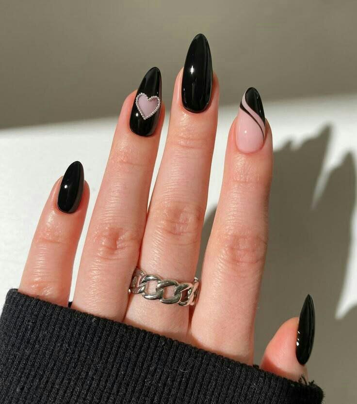 Glossy black nails are paired with soft pink accents and a delicate heart charm for a simple but chic look. The swirl detail adds a modern, feminine twist that keeps it winter-appropriate.