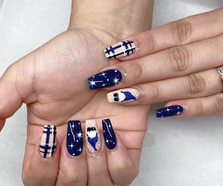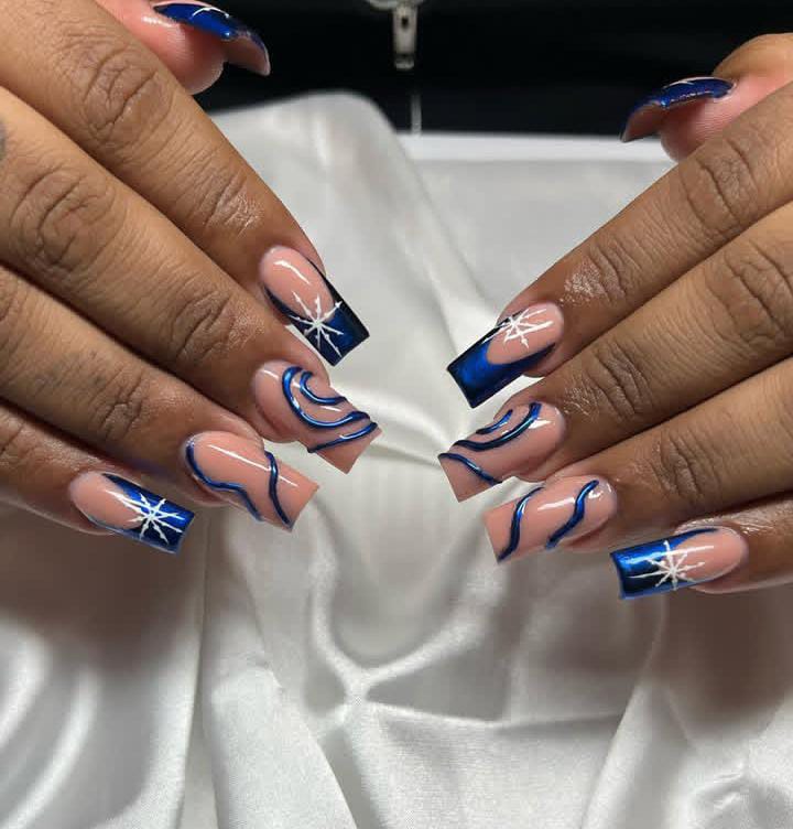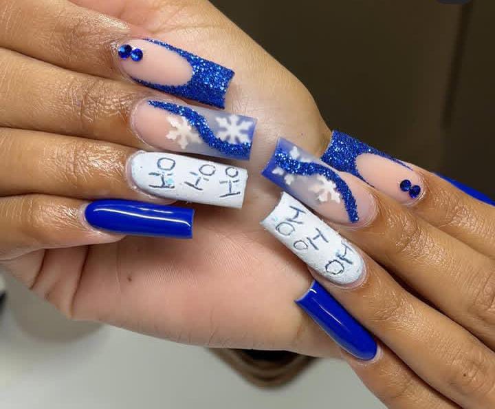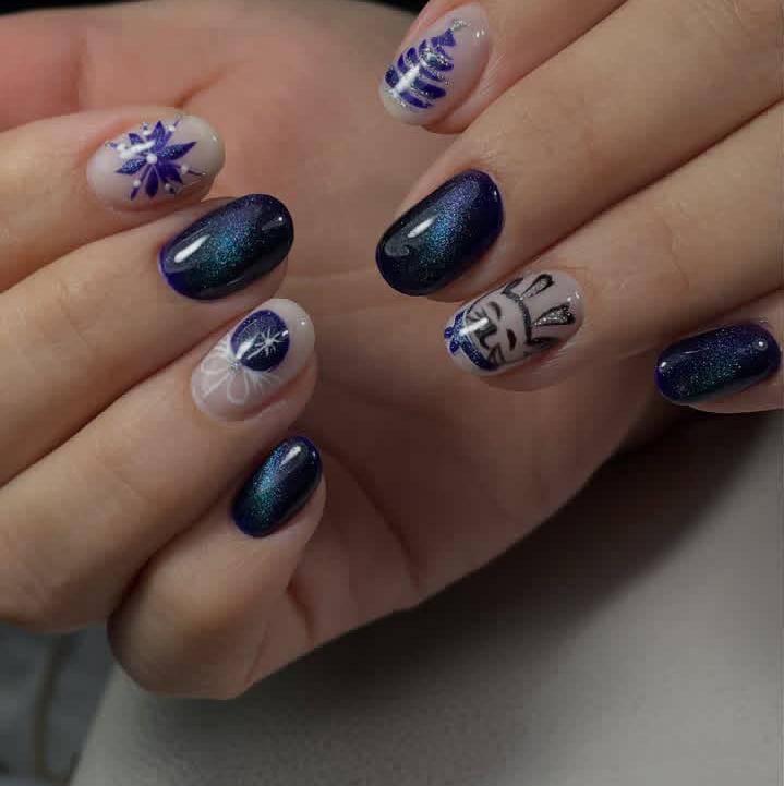 Dark, shimmering blue nails mixed with snowflakes and Christmas holiday-themed art create a cozy, magical feel. The playful accents add personality while keeping the wintery theme strong.
