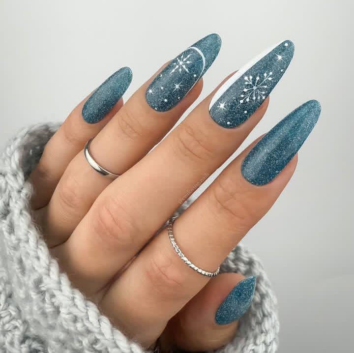 Shimmering blue nails with snowflakes and twinkling stars capture the magic of a snowy Christmas night sky. The long almond shape makes the design stand out beautifully.
