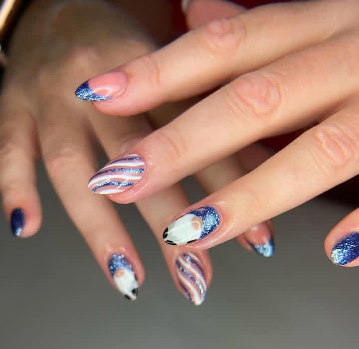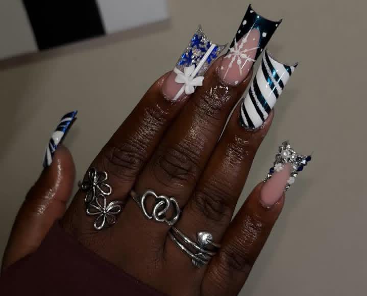 Bold navy and white stripes mix with glitter, snowflakes, and 3D accents for a dramatic holiday look that feels both Christmas festive and edgy.