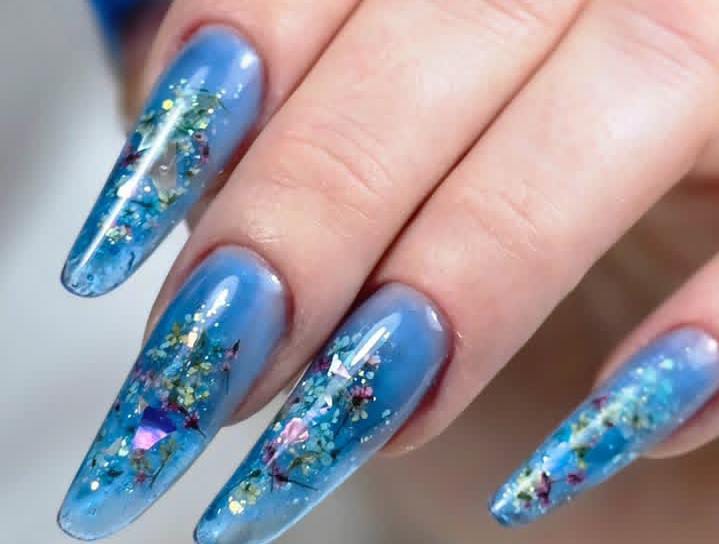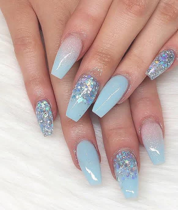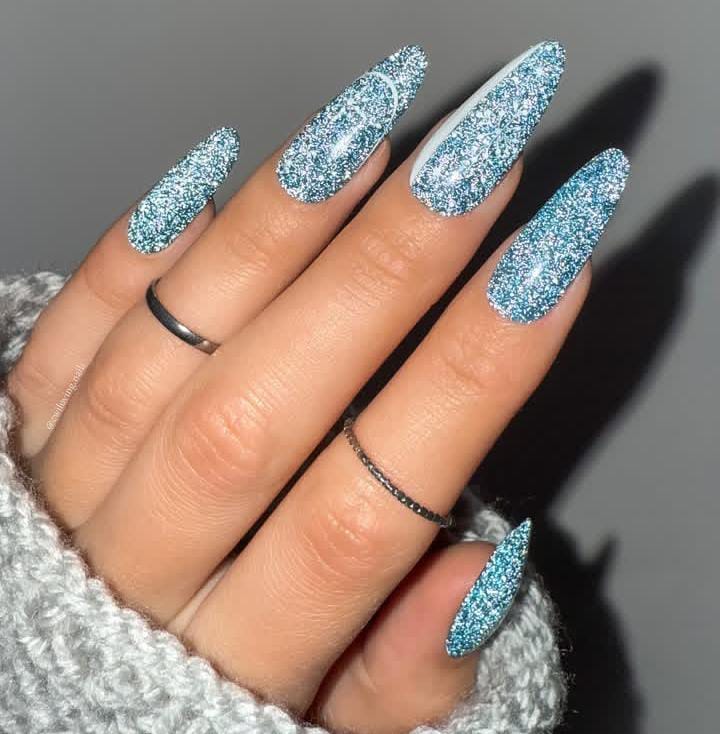 Fully coated in shimmering blue glitter, these long nails shine like frozen icicles. The look is bold, eye-catching, and perfect for a glamorous Christmas night.