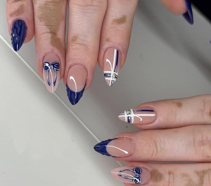 Dark blue French tips paired with white ribbon and bow accents bring the feeling of Christmas gifts wrapped under the tree. It’s chic, playful, and full of holiday spirit.