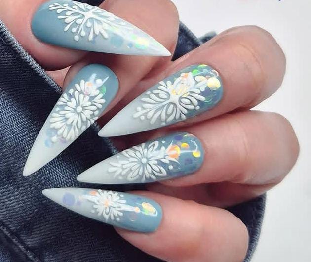 Soft icy blue fades into white tips, accented with delicate white floral snowflake patterns and subtle holographic sparkles, creating a frosty winter Christmas vibe.