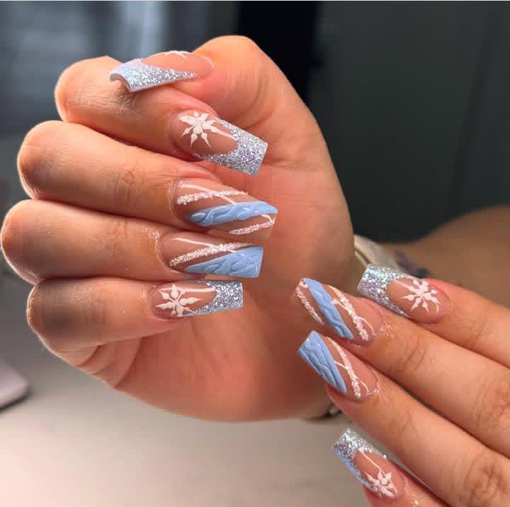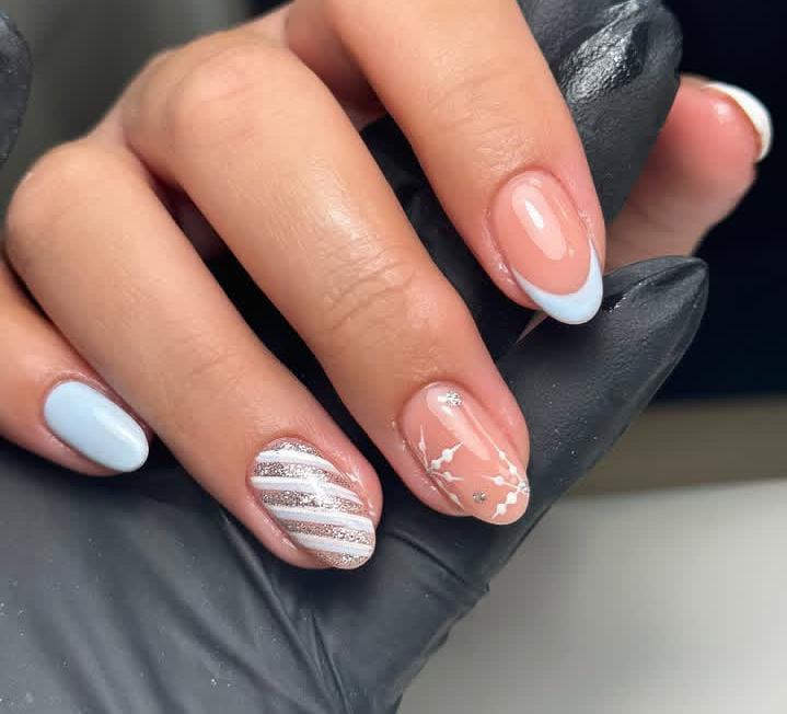 Soft blue and nude tones are paired with silver glitter stripes and delicate white details, giving these nails a light and classy winter Christmas vibe. The mix of French tips and sparkle feels festive yet subtle.