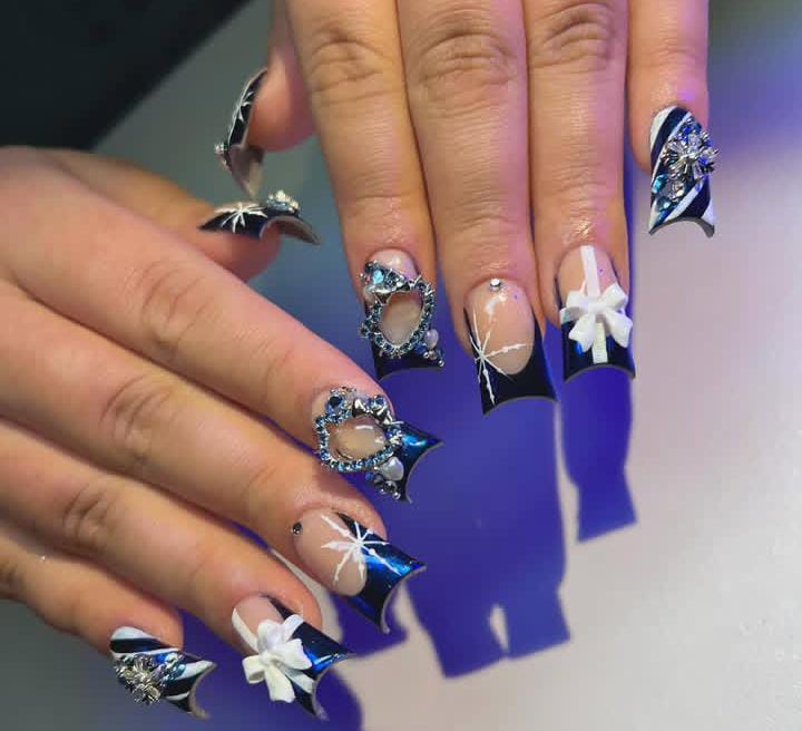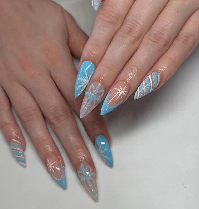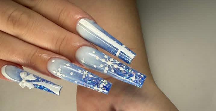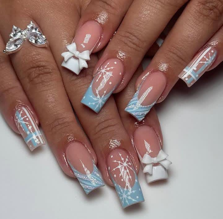 Long icy blue nails decorated with glitter fades, white bows, and snowflake accents create a dramatic, glamorous style that captures the magic of a frosty Christmas evening.