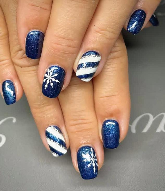 Shimmering navy nails accented with crisp white stripes and snowflake art, giving a simple yet elegant Christmas holiday feel reminiscent of frosty winter nights.