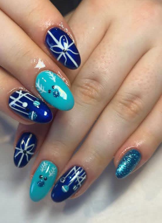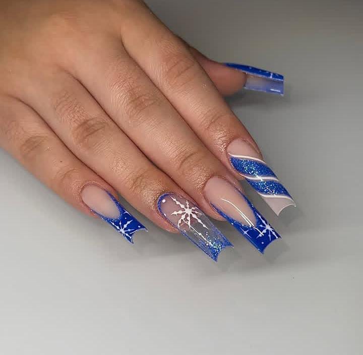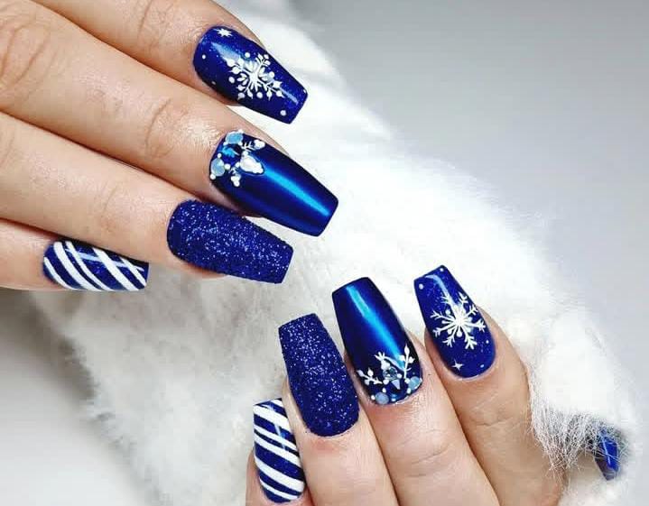 Bold cobalt blue nails paired with glitter textures, snowflake art, and candy-cane stripes bring a striking and festive Christmas look that is both glamorous and fun.