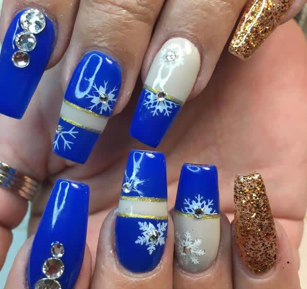 A bold cobalt blue base paired with nude accents, sparkling rhinestones, and delicate white snowflakes, finished with hints of gold striping for a glamorous winter Christmas vibe.