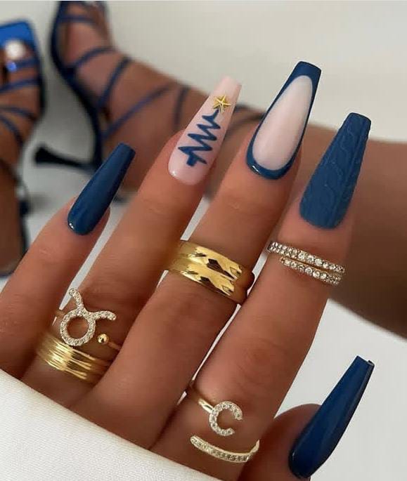 Deep navy nails highlighted with a single nude accent nail featuring a simple blue Christmas tree topped with a gold star, blending elegance with playful holiday spirit.
