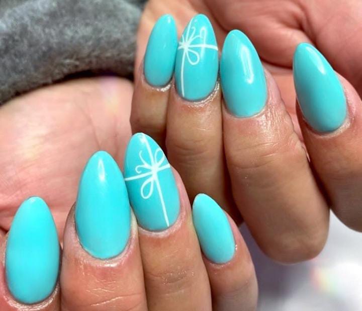 Bright icy-blue nails with a glossy finish, accented by a minimal white ribbon design that resembles beautifully wrapped Christmas holiday presents.