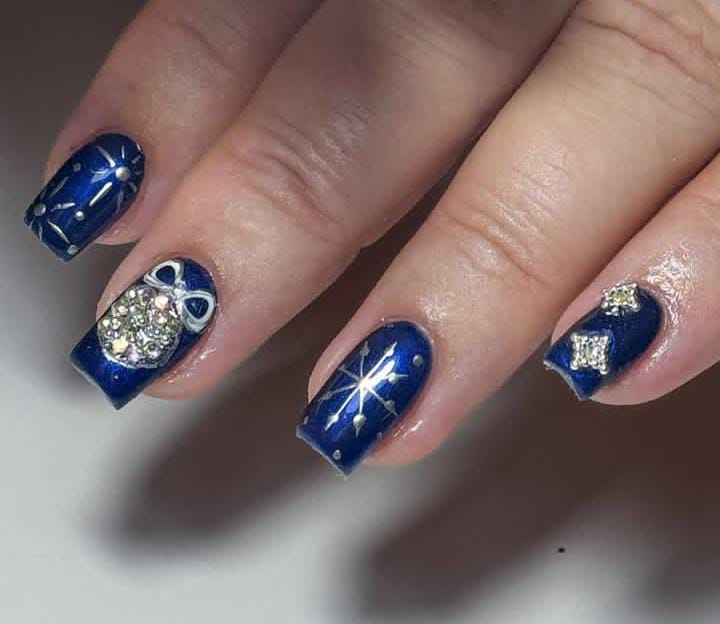 Rich navy blue nails highlighted with shining starbursts, snowflakes, and rhinestone bows bring out a glamorous, festive night-sky effect. Bold and dazzling for Christmas celebrations.