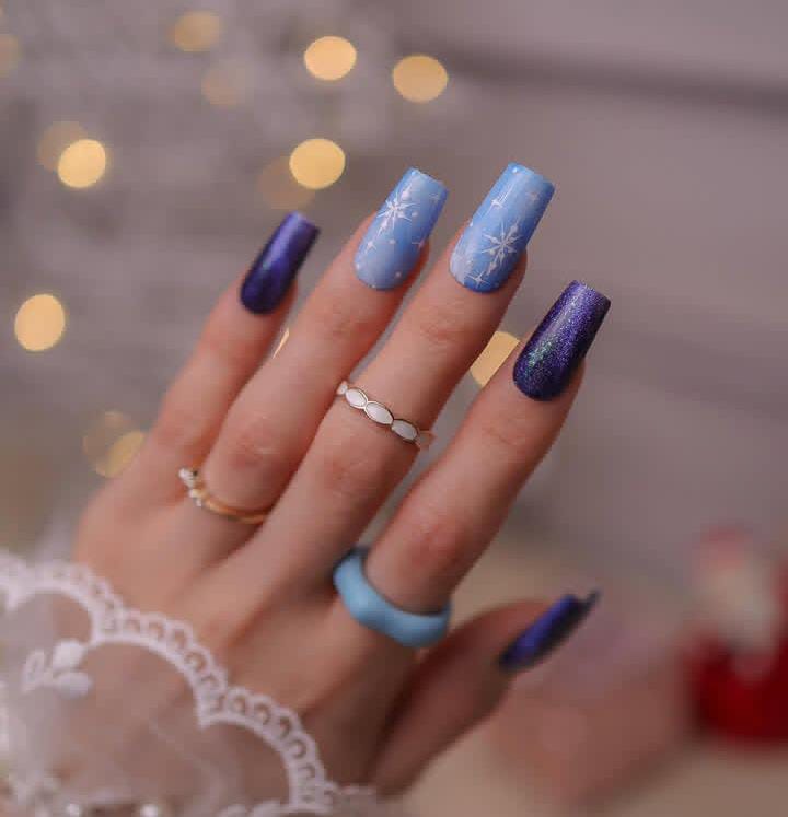 A blend of deep purple shimmer and icy blue nails decorated with snowflakes creates a magical, night-sky effect. This design feels bold, festive, and perfect for winter and Christmas evening.