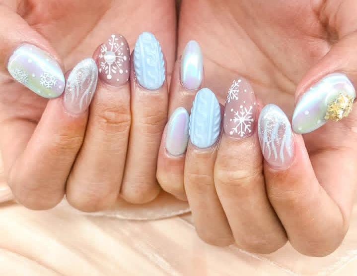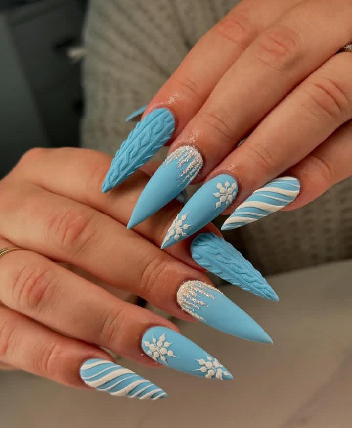 Matte sky-blue nails are dressed up with knitted sweater textures, snowflakes, and silver glitter accents, giving off a cozy yet striking holiday look. It’s playful, warm, and winter-ready for Christmas finish.