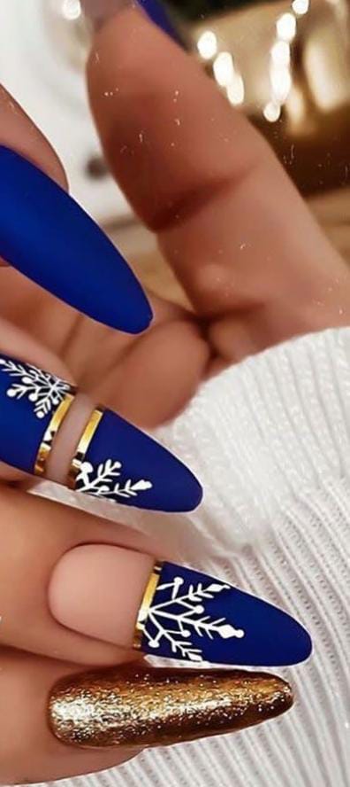 Rich matte royal blue nails with crisp white snowflakes and gold accents are balanced with a sparkling golden nail, making the whole set feel regal and Christmas festive. This design is bold and luxurious.