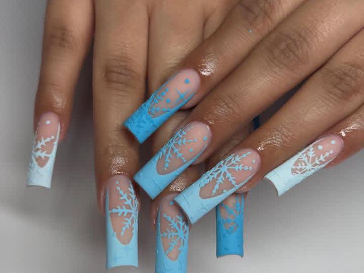 Long square nails blend icy blue tips with sheer nude bases, detailed with snowflake patterns that look like frosted glass. The style is chic, modern, and instantly Christmas wintry vibe.