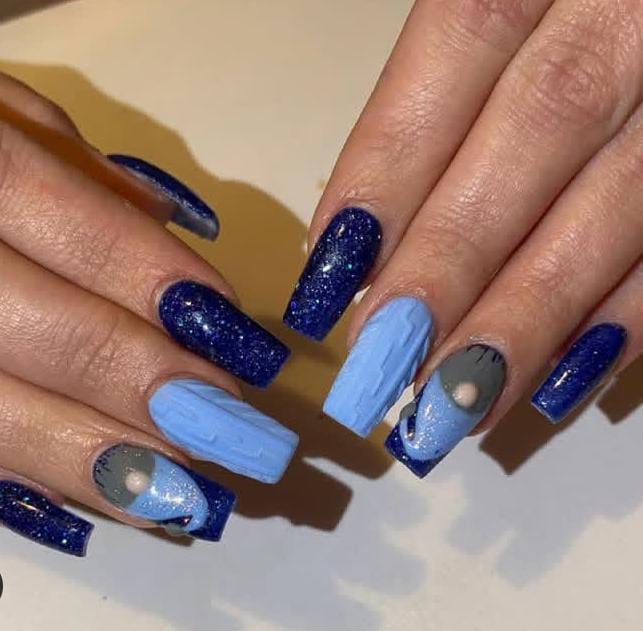 Deep navy glitter nails paired with icy blue textured and art-accented tips create a bold yet festive look. The mix of shimmer and playful details makes this design perfect for Christmas holiday nights.