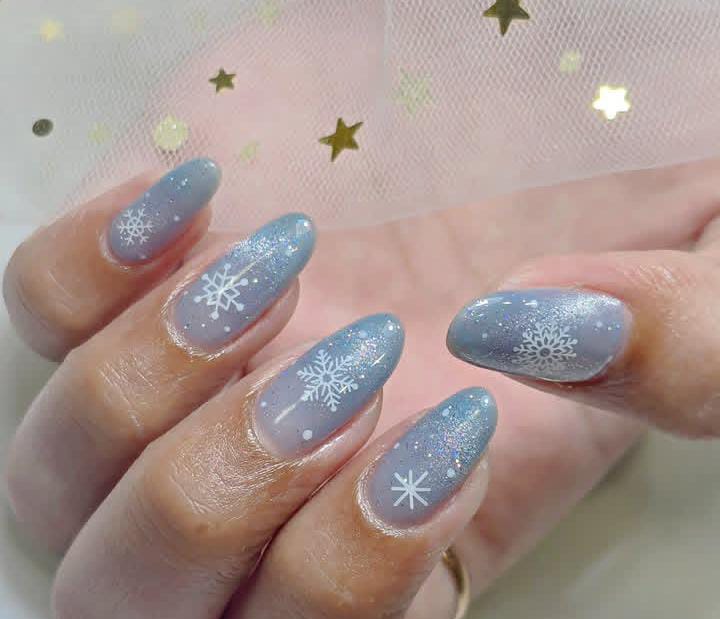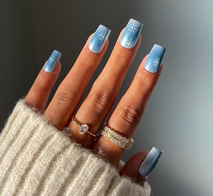 Soft gradient blue nails with delicate white starbursts bring a dreamy, frosty vibe. The simple elegance gives off a calm winter wonderland Christmas feel.