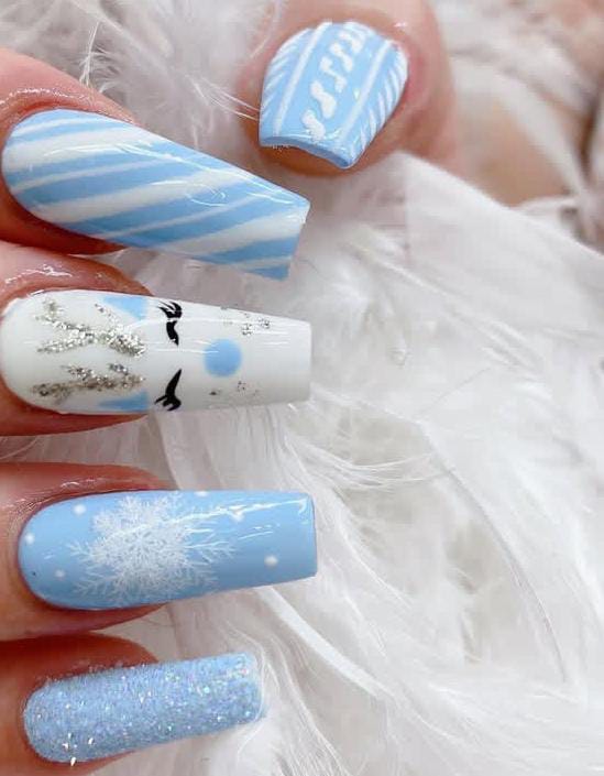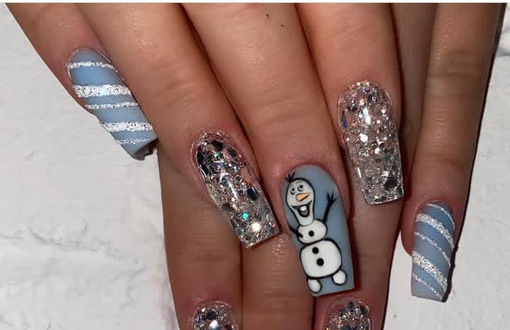 This playful design combines glittery silver accents, icy blue stripes, and a cheerful snowman feature nail for a festive winter vibe. It’s lighthearted yet sparkly, perfect for Christmas holiday fun.