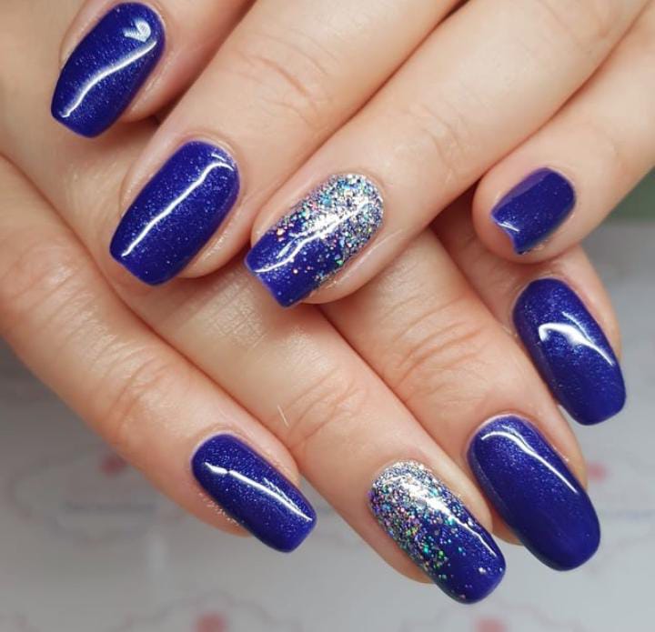 Classic cobalt blue nails with a single sparkling silver glitter accent capture the richness of Christmas lights. Sleek, shiny, and striking, this look is perfect for those who love bold simplicity.