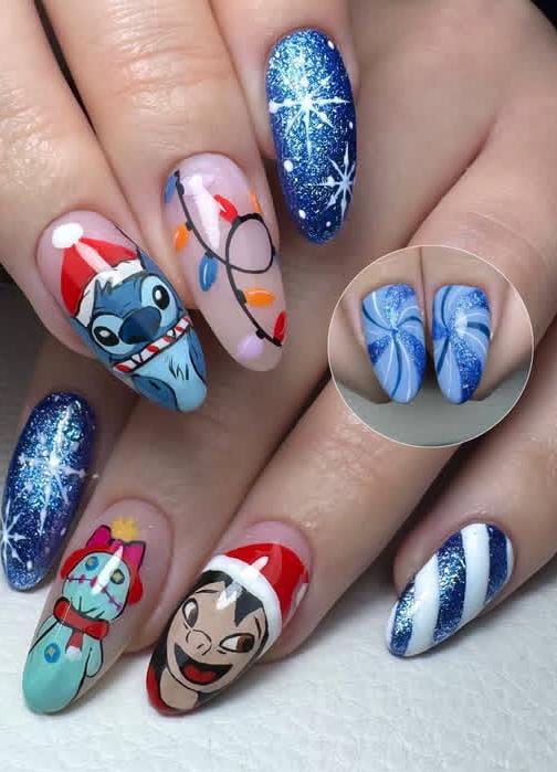 This design mixes deep blue glitter, candy-cane stripes, and playful holiday characters for a bold, fun Christmas vibe that feels cheerful and animated.