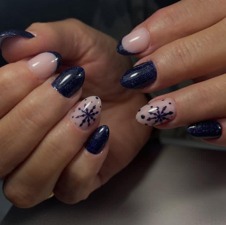 A dark, starry blue base is softened with nude nails featuring delicate snowflake art, giving a cozy yet elegant Christmas winter look.