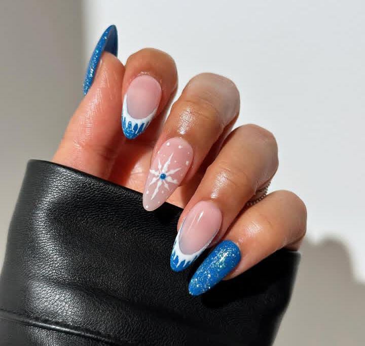 Classic French tips get a frosty twist with icy blue glitter, snowflake accents, and a mix of shimmer that feels fresh and Christmas festive.