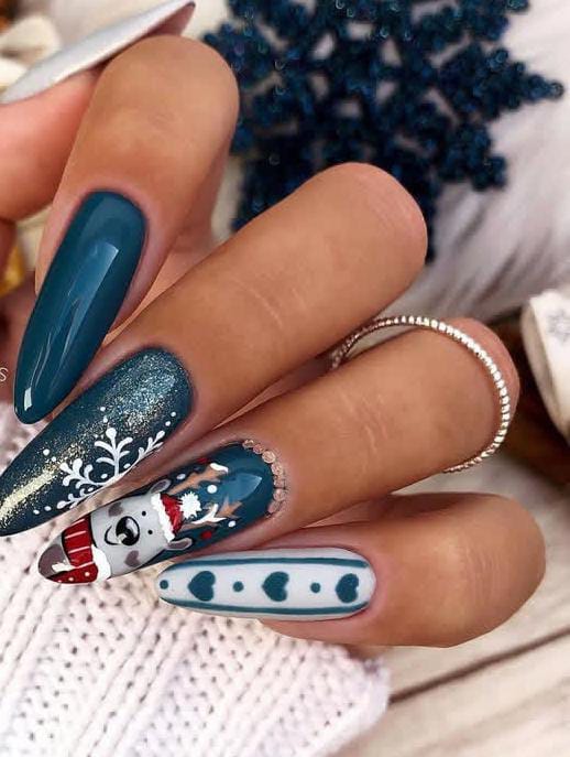 A playful combo of bright blue and turquoise nails featuring reindeer faces, glitter accents, and snowflake-inspired patterns for a cute and cheerful Christmas design.