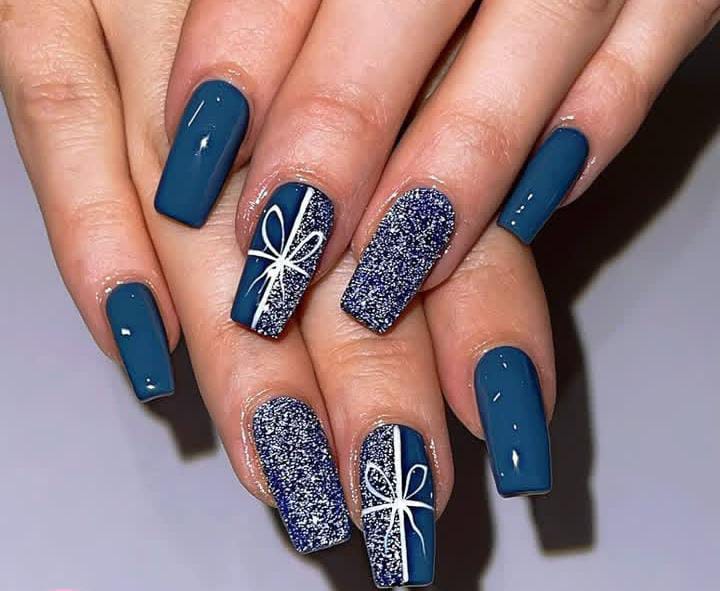 Matte teal nails are combined with glittery blue accents tied with white bow art, giving the effect of beautifully wrapped Christmas presents.