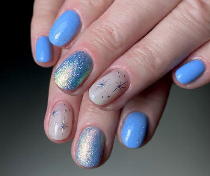 With a mix of glossy blue polish, shimmering holographic accents, and tiny star details on a nude base, this design feels like a magical winter Christmas night sky full of sparkle.