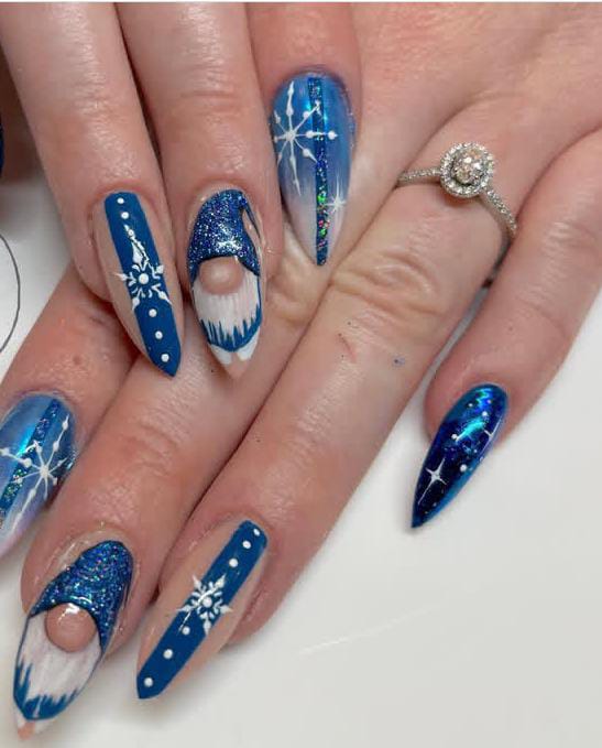 Glittery blue tips mix with striped accents, a Christmas gnome and a touch of snowy white, creating a playful holiday sparkle. The mix of shimmer and patterns gives a fun, party-ready Christmas vibe.