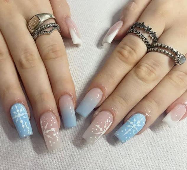 A soft ombré base of nude to icy blue topped with delicate white snowflakes creates a simple yet enchanting style. It feels fresh, elegant, and perfect for a cozy Christmas season.