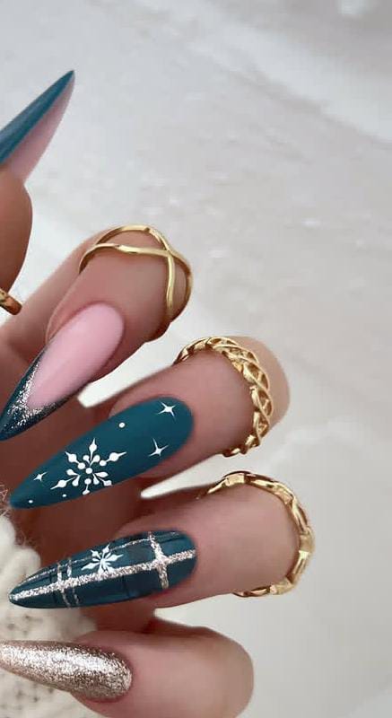A mix of deep teal, pink, and glittery accents with bold snowflake and star patterns, giving a festive yet classy Christmas winter vibe. The sharp almond shape adds a dramatic holiday touch.