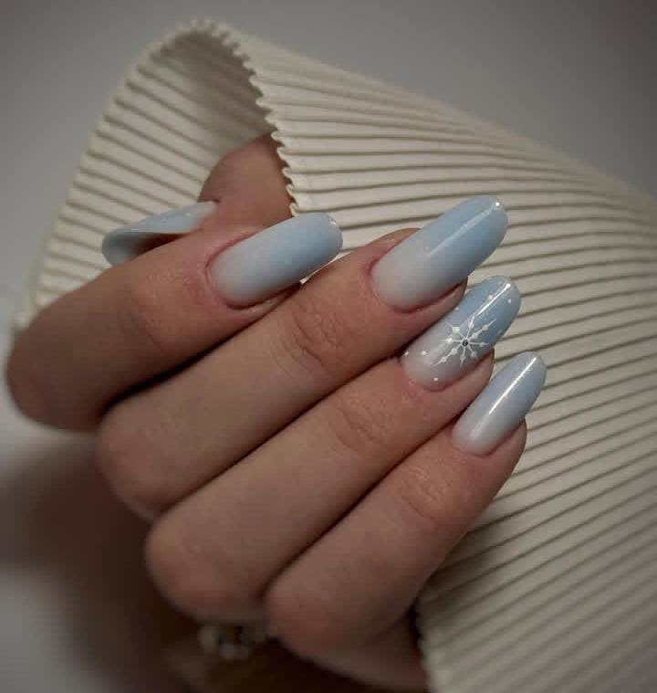 Soft blue-to-white ombré nails with a delicate snowflake detail create a frosty, serene look that feels like fresh winter mornings. Simple, clean, and graceful Christmas finish.