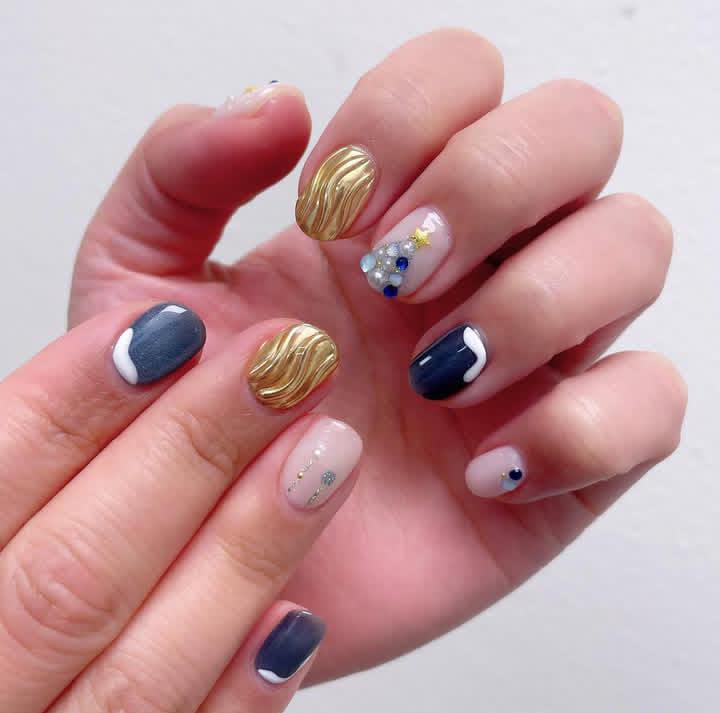 A creative blend of navy, gold, and nude bases decorated with metallic textures, jewels, and star accents. This design feels playful yet chic, perfect for a modern, Christmas holiday look.