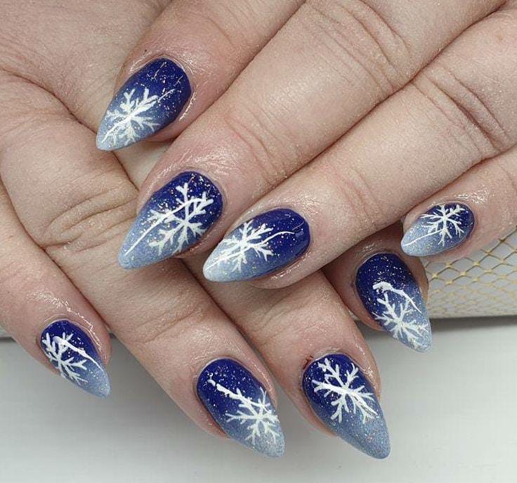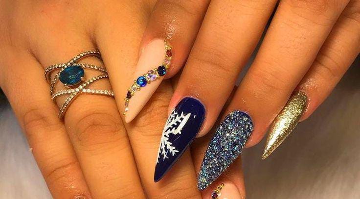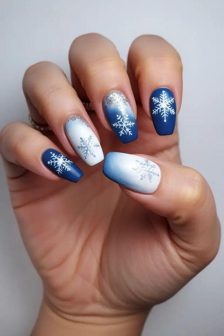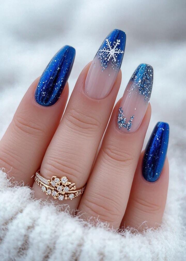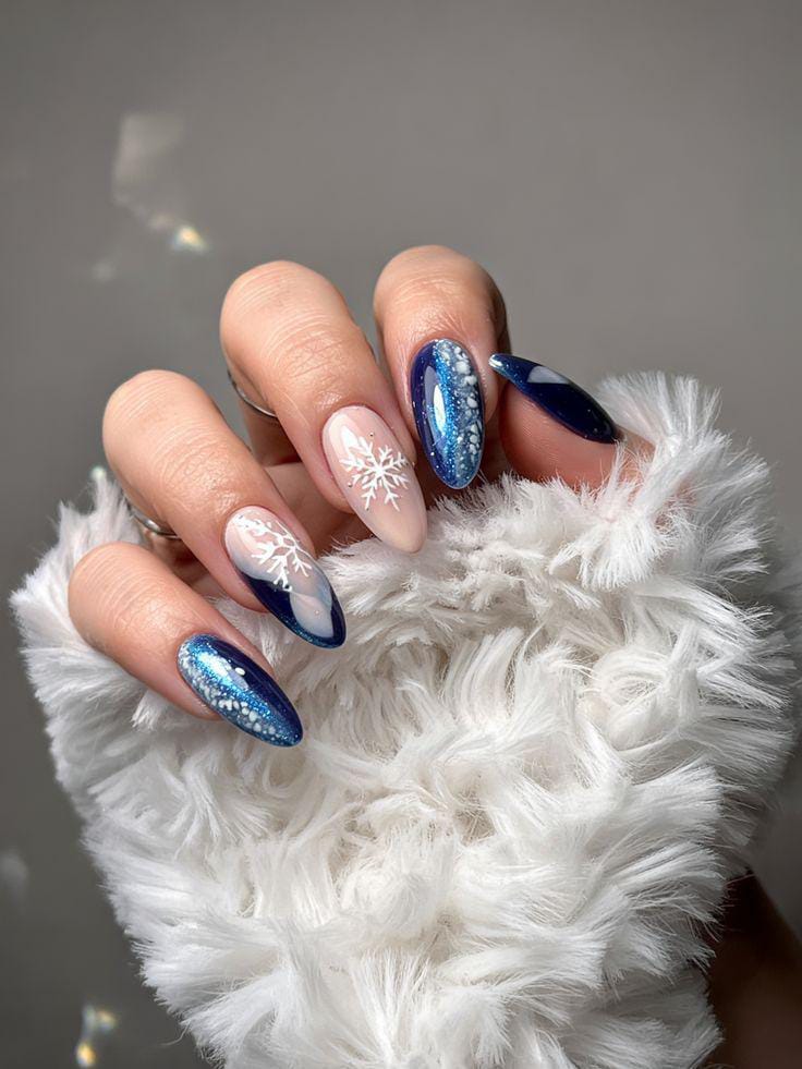 A mix of deep navy, icy shimmer, and soft nude tones creates a bold winter contrast, highlighted with clean snowflake accents. It blends elegance with a cozy, cold- January weather vibe.