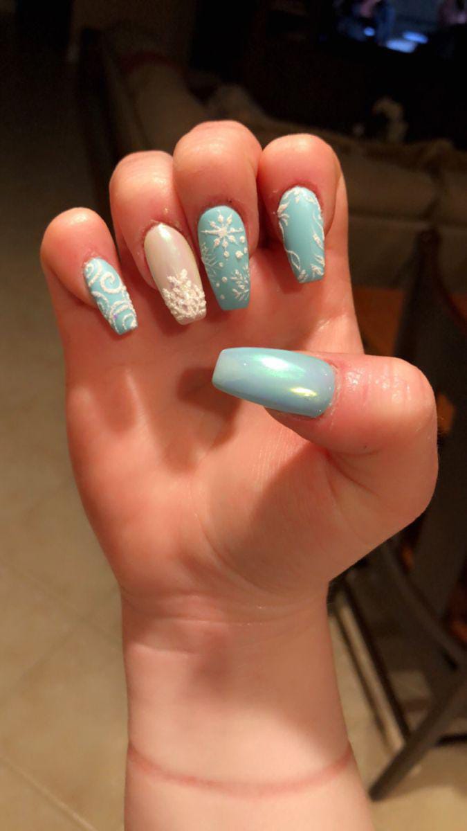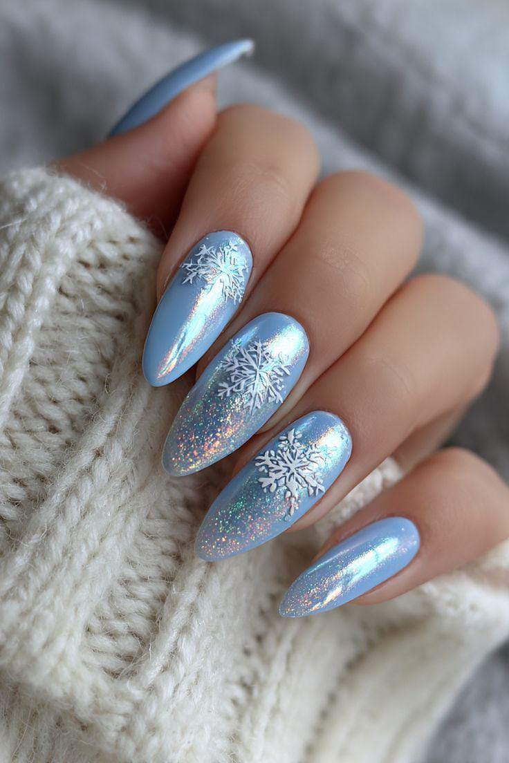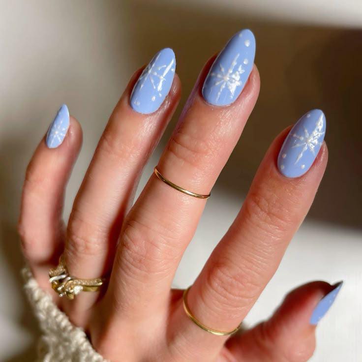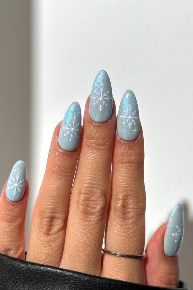 This design features soft, pastel-blue nails decorated with delicate white snowflakes, giving a clean and cozy winter feel. The look is simple yet festive, perfect for a calm January vibe.