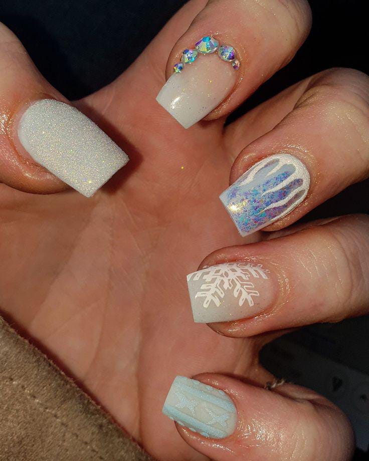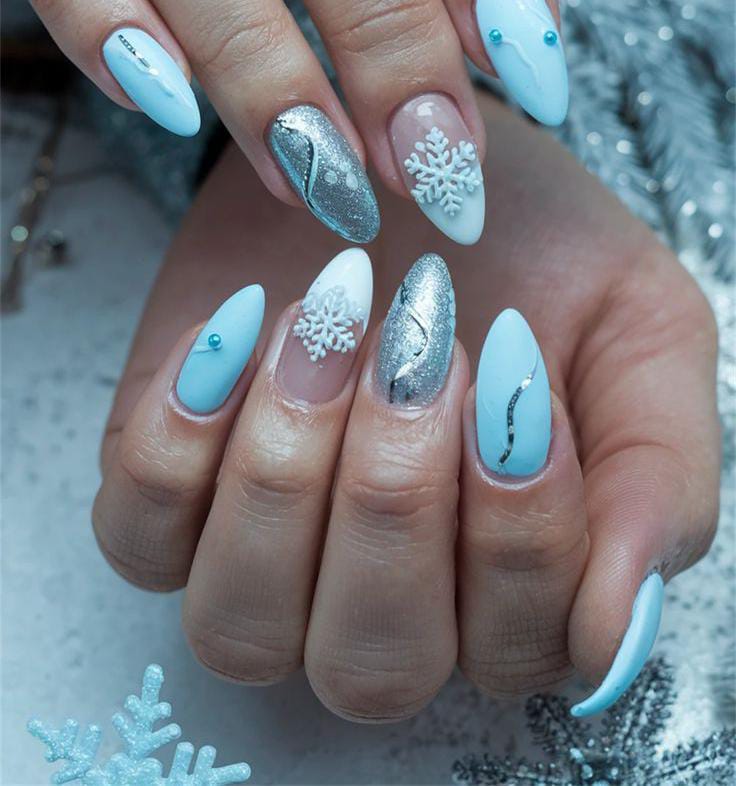 This look blends soft icy-blue tones with touches of silver glitter, smooth white accents, and raised snowflake details, creating a cool, winter-fresh vibe. The mix of matte and glossy finishes, gives the whole design a crisp, elegant January feel.