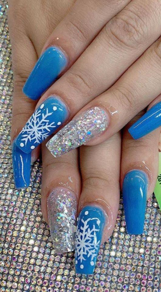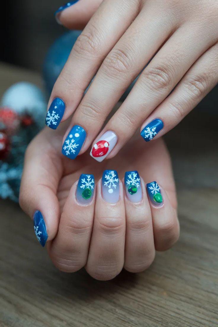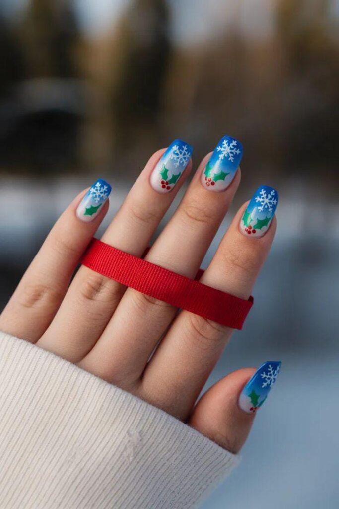 Featuring bright blue tips, white snowflakes, and small holly accents, this look blends fun Christmas energy with cool January colors. It feels cheerful yet wintry, perfect for the transition from holiday to mid-winter.