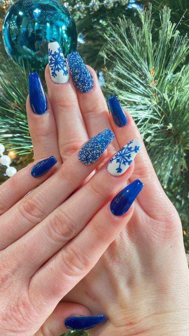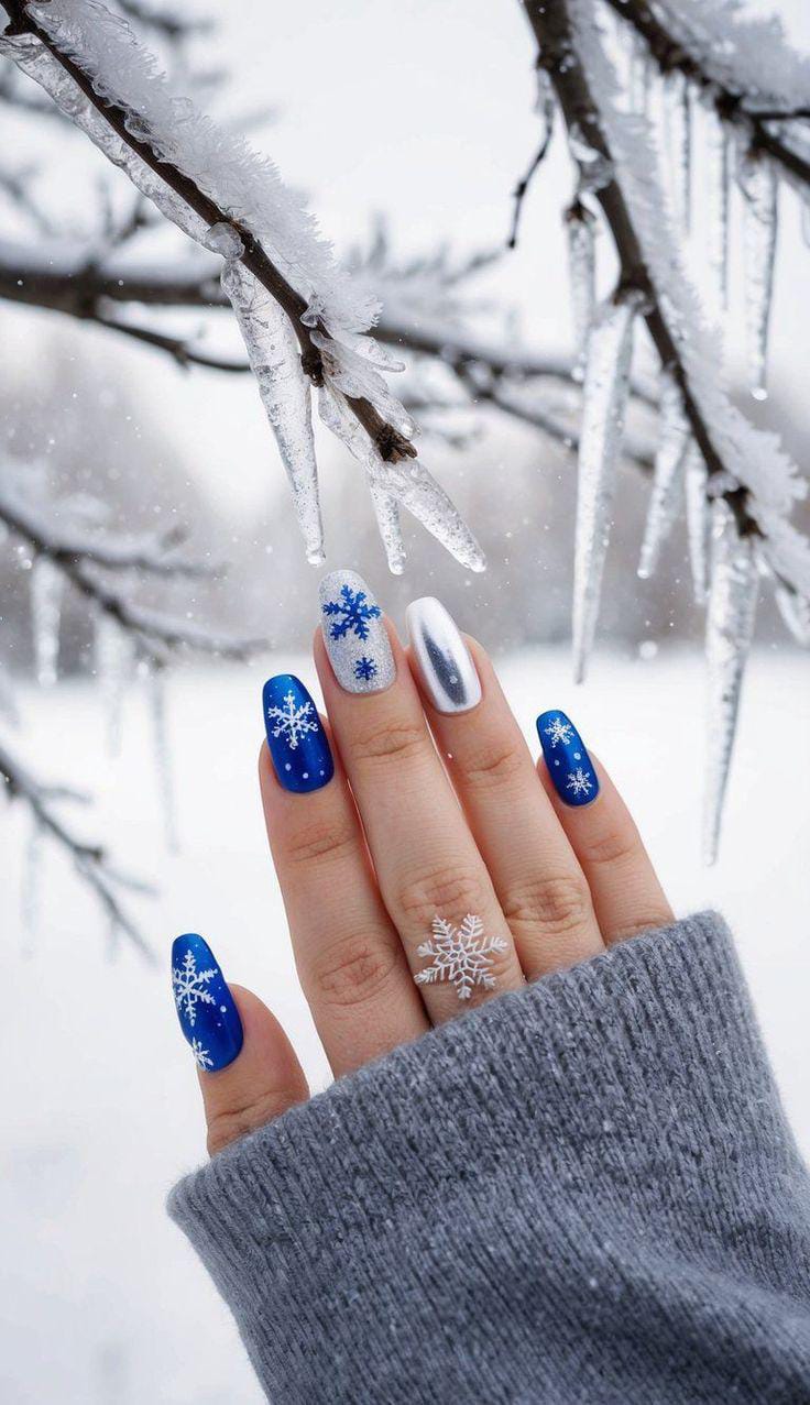 Deep royal blue nails paired with silver-white shimmer and crisp snowflake motifs create a bold, icy winter January look. The mix of matte and metallic finishes gives it a striking, frosty elegance.