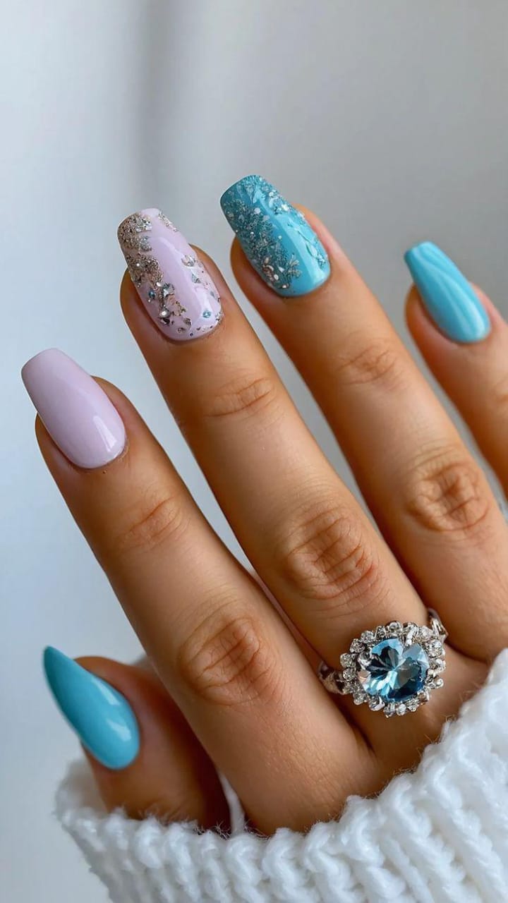 Soft pastels and cool aqua blues come together with sparkling glitter accents for a fresh, polished January look. The combination of clean shine and textured sparkle gives it a chic, winter-crystal aesthetic.