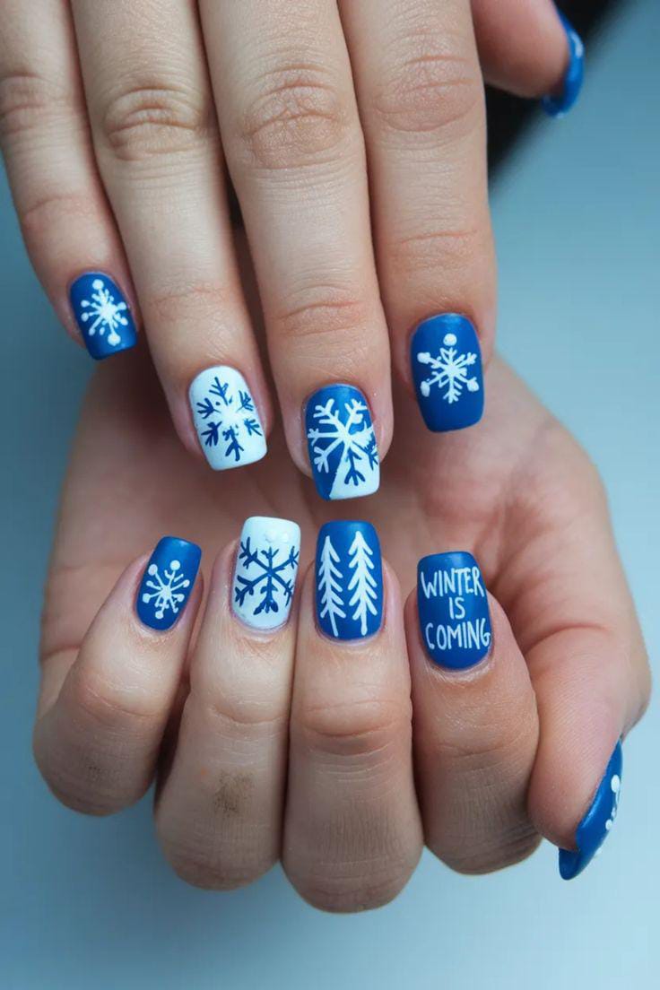 This design mixes bold royal-blue nails with crisp white accents, all decorated with hand-drawn snowflakes and wintry tree silhouettes for a fun, chilly January vibe. The look feels playful yet seasonal, perfect for embracing deep-winter energy.