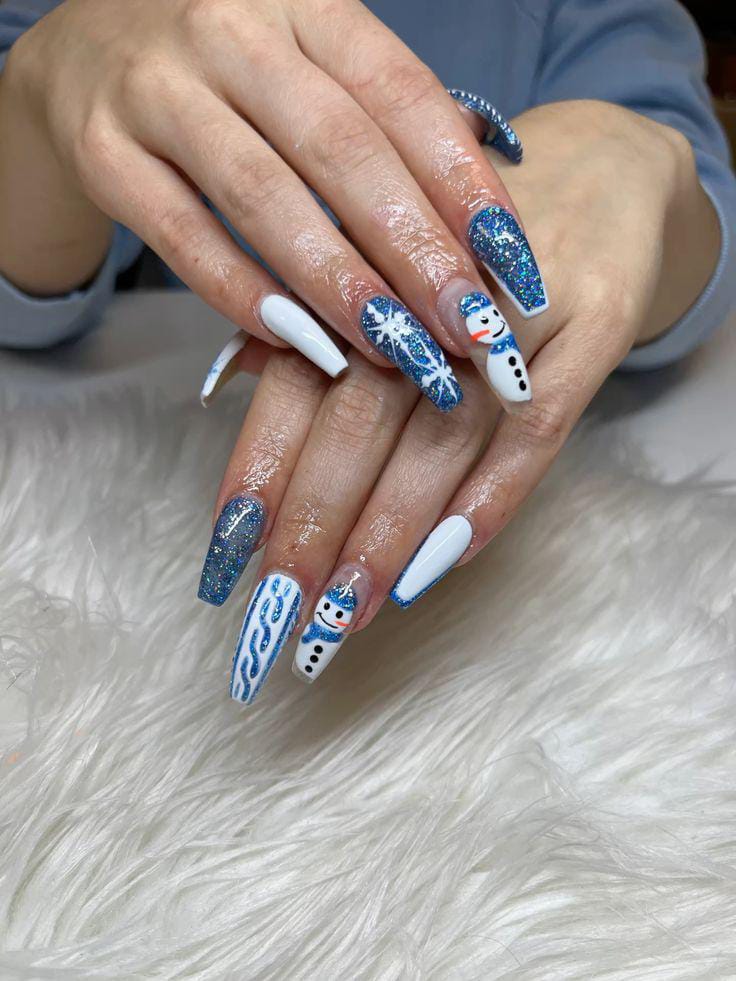 A blend of glittery blue, clean white tips, and cute snowman art creates a lively, festive winter look. The long nails and shimmering details make the whole design feel bright, joyful, and perfect for cozy January moods.