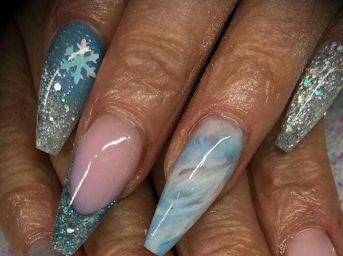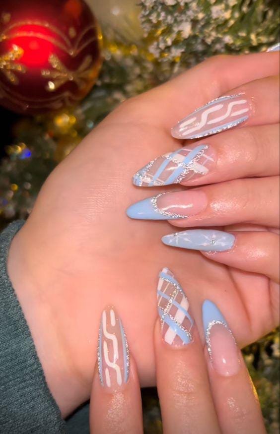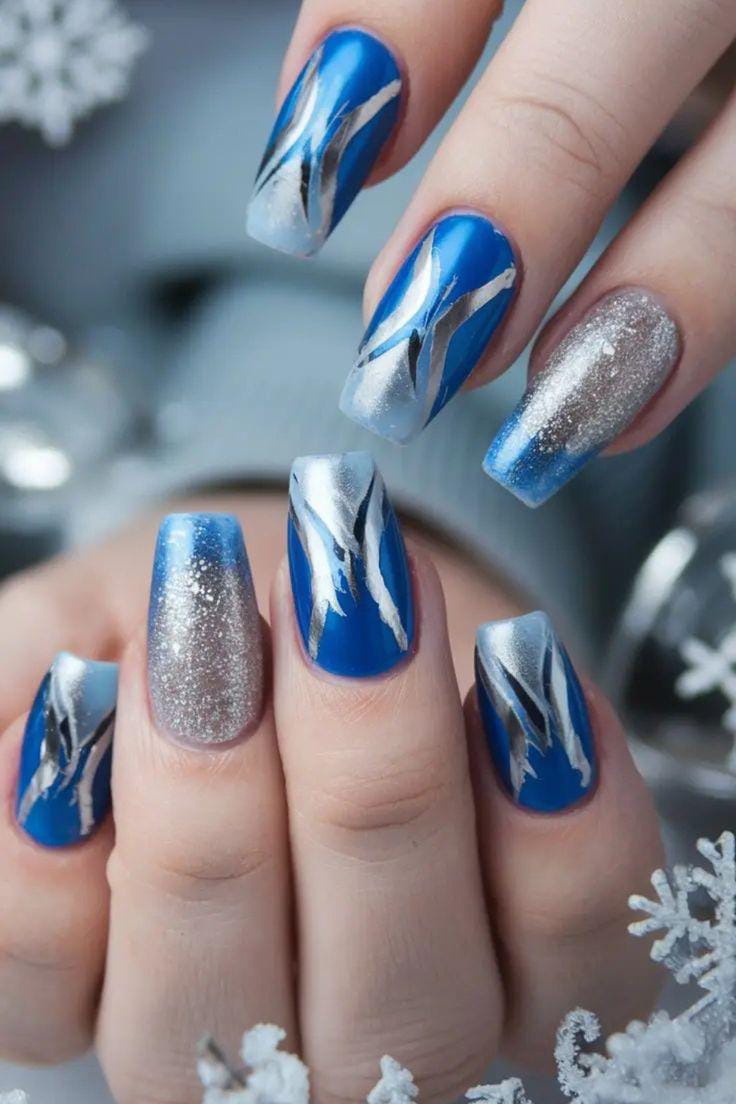 Bold blue nails paired with sweeping silver and white strokes create a dynamic, icy effect that feels like frozen winds across a January winter landscape. The added silver glitter nails give it a glamorous edge.