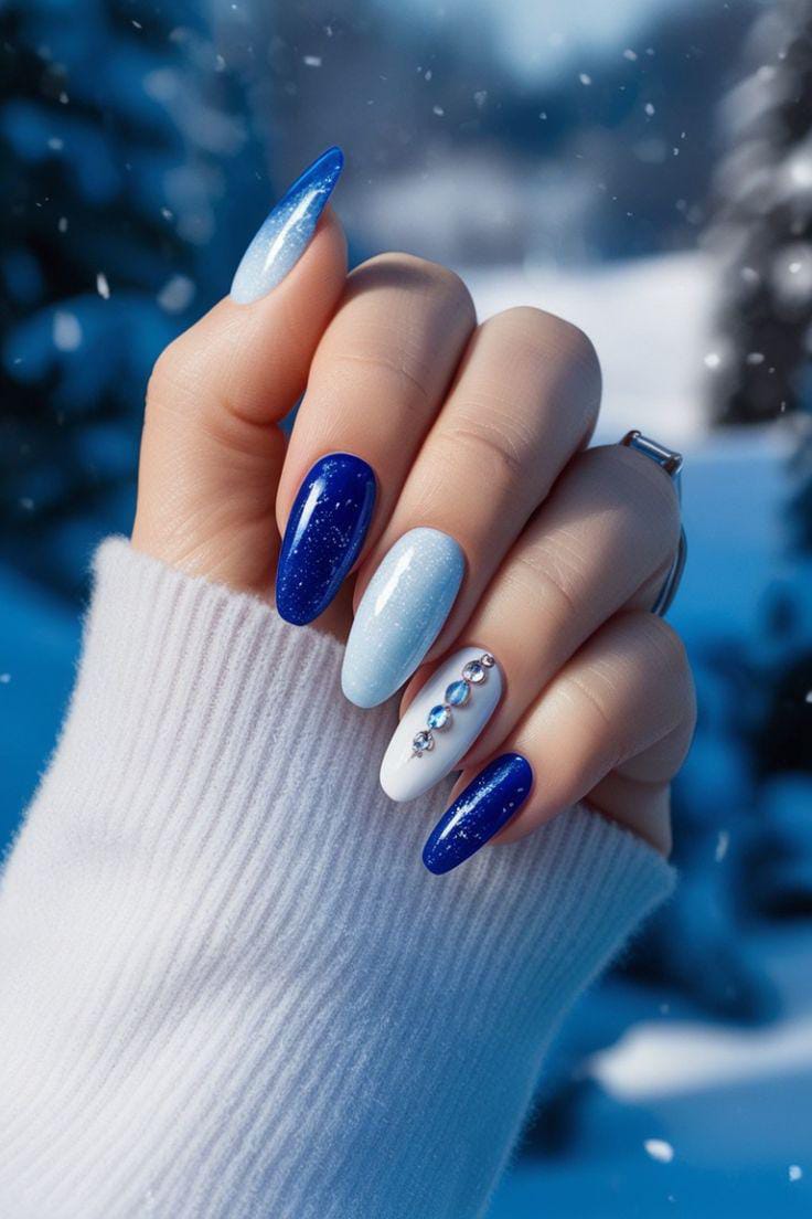 A mix of bold royal blue, frosty white, and soft icy gradients gives this look a cool, wintry feel, highlighted with subtle sparkles and a line of crystals for extra shine. It’s clean, bright, and captures the calm beauty of snowy January days.