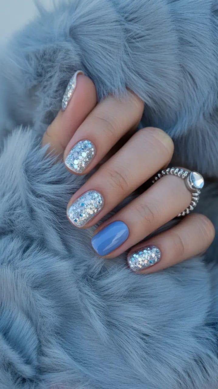 A blend of icy silver glitter and soft winter blue creates a frosty, light-catching manicure that feels clean, cool, and elegant. Perfect for a sparkling, fresh-start January vibe.