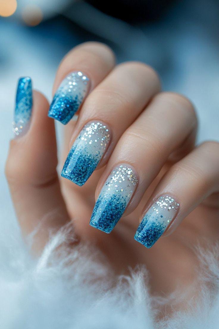This look features a soft gradient of blue glitter fading into a snowy white base, giving the impression of gentle snowfall. It’s delicate, frosty, and perfect for capturing the chill of early January.
