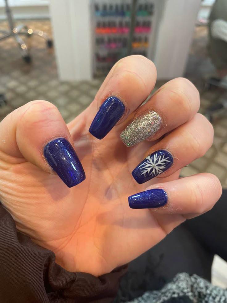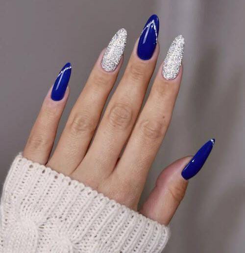 Deep royal blue nails are paired with bright silver glitter, creating a striking contrast that feels both bold and wintry. The sleek shape and glossy finish make it a chic January standout.