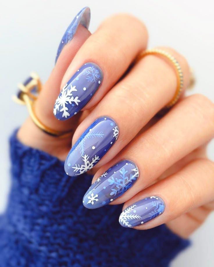 Matte blues in alternating shades paired with simple white snowflake accents give this look a clean, modern, and softly seasonal January vibe.