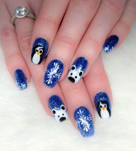 Sparkly midnight-blue nails are paired with playful penguin and polar bear art, bringing a fun and whimsical winter January theme. The glittery background gives the design a frosty, animated charm.
